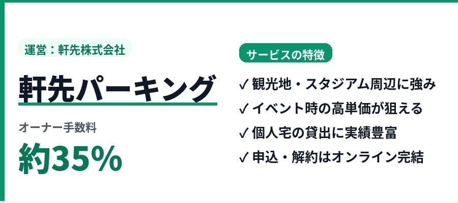軒先株式会社が運営する、駐車場シェアリング業界の最古参サービスの一つ。もともと「軒先(のきさき)」というスペースシェア事業の派生として始まり、個人宅の貸出ノウハウが豊富です。手数料は約35%と、特Pに次ぐ低水準です。 特に強みを発揮するのが観光地・スタジアム・ドーム球場・コンサート会場周辺などのイベント需要が高いエリア。「日単位」での貸出が中心となるため、時間貸しよりもまとまった単価を狙いやすい設計です。 こんな人におすすめ:自宅が観光地・スタジアム周辺にある/イベント需要を狙いたい/高めの単価で貸し出したい