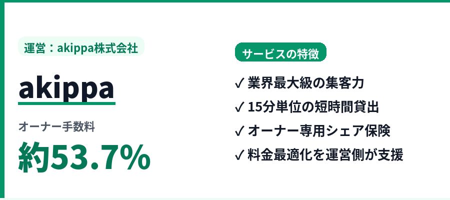 akippa約53.7%15分〜× (時間貸し中心)大 (累計会員490万人超)オーナー専用 シェア保険あり公式▶